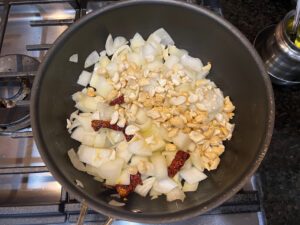 - Add the onions, cashews, and dried red chilis and fry them for about 5-7 minutes on medium flame, or until the onions start to turn light brown