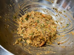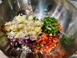 - Then add all vegetables and herbs, eggs (beaten well), and other ingredients listed. Mix well to form a soft dough