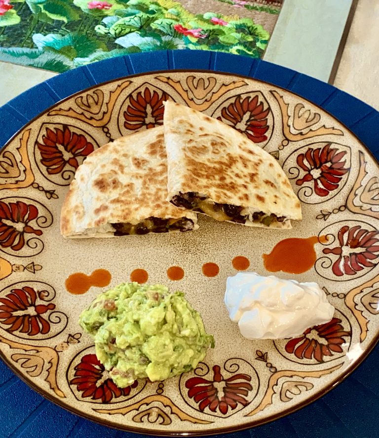 The Guacamole dip with fresh avocados is a perfect complement to this dish. Please click this link to access my recipe for Guacamole. We can also serve Quesadilla with salsa, guacamole and/or sour cream.